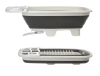 Adjustable drain swivels and collapses to one third its size. Holds up to 10 plates.